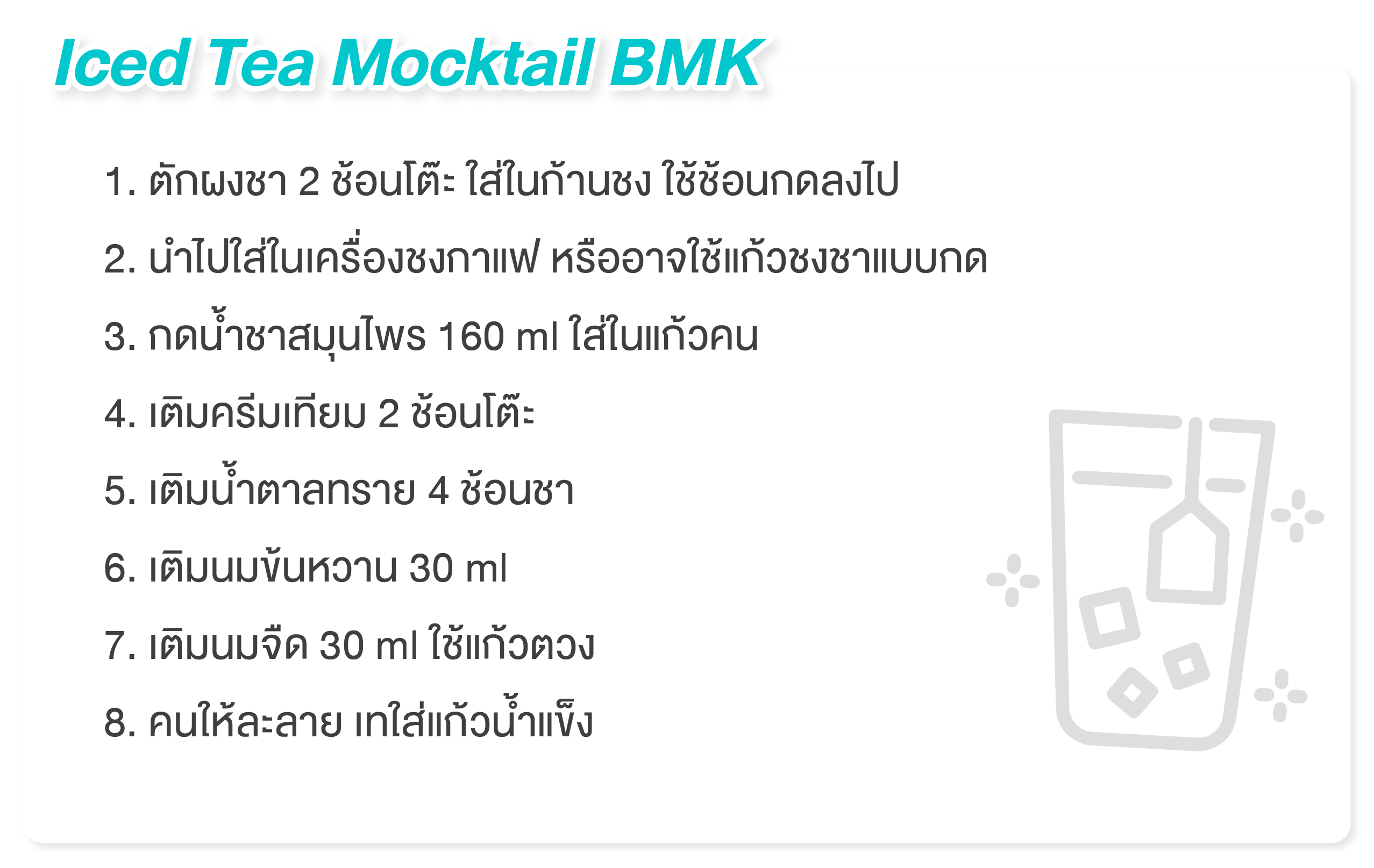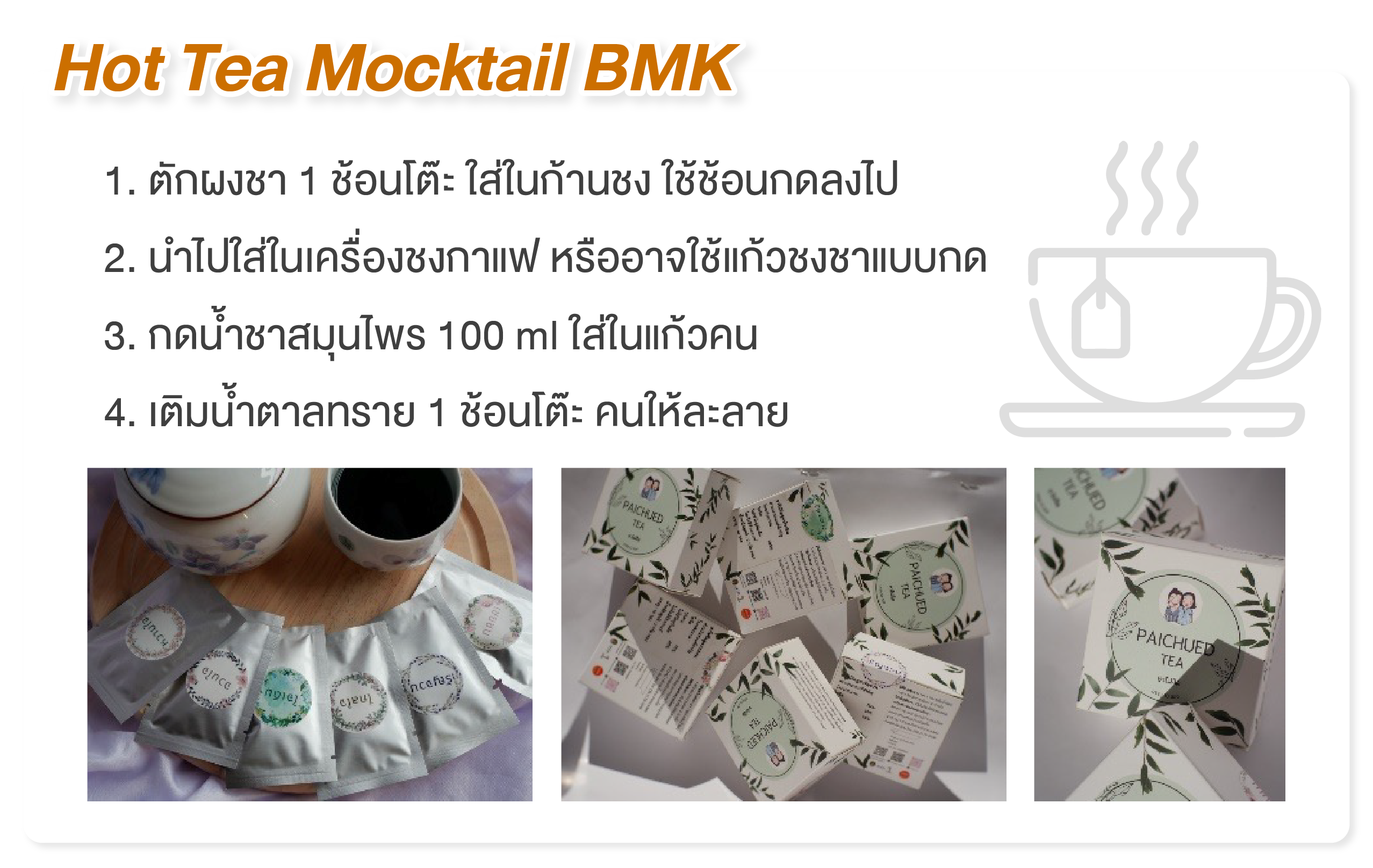 เครื่องดื่มเพื่อสุขภาพที่มีส่วนผสมจากผลิตภัณฑ์สมุนไพรในท้องถิ่นที่มีประโยชน์ ดีต่อสุขภาพ เช่น ชาไผ่จืด ชาโกศจุฬาลัมพา และนำไปประยุกต์เป็นส่วนผสมเพื่อสุขภาพ ร่วมกับผลไม้ หรือเครื่องดื่มอื่นๆ